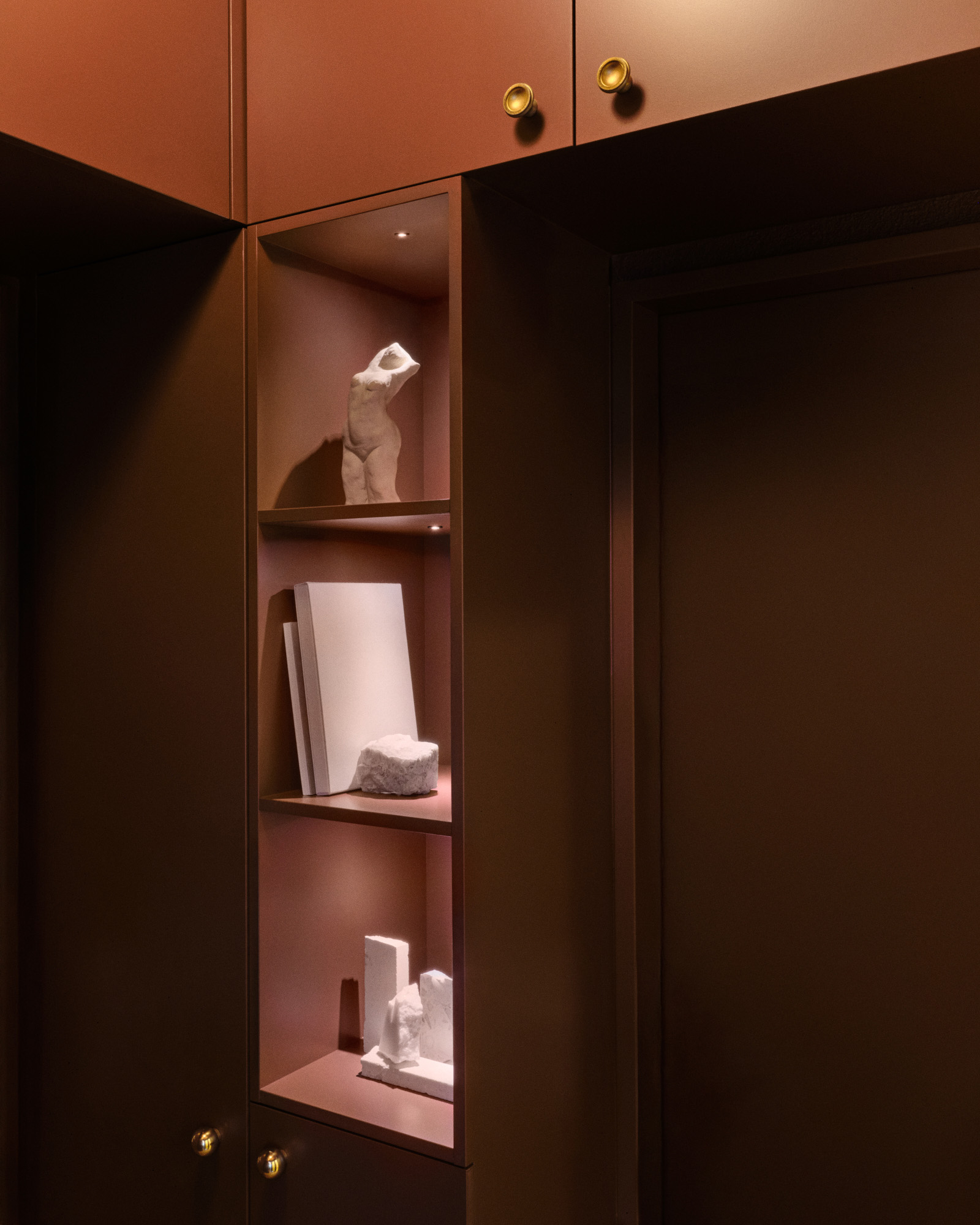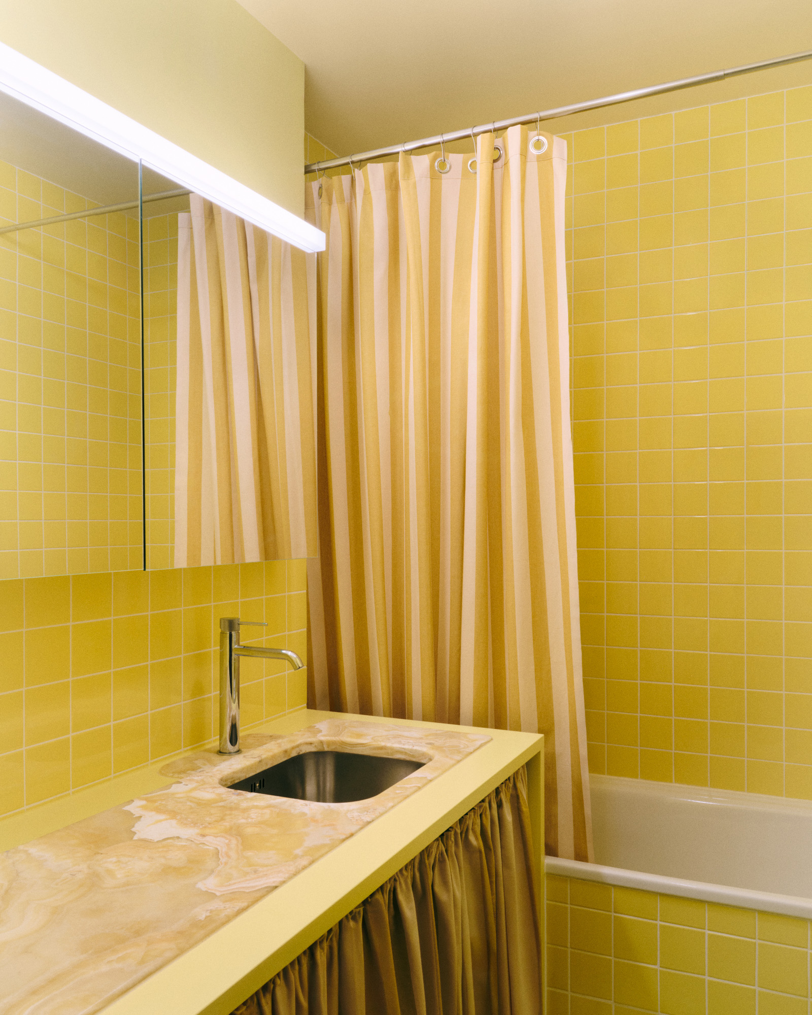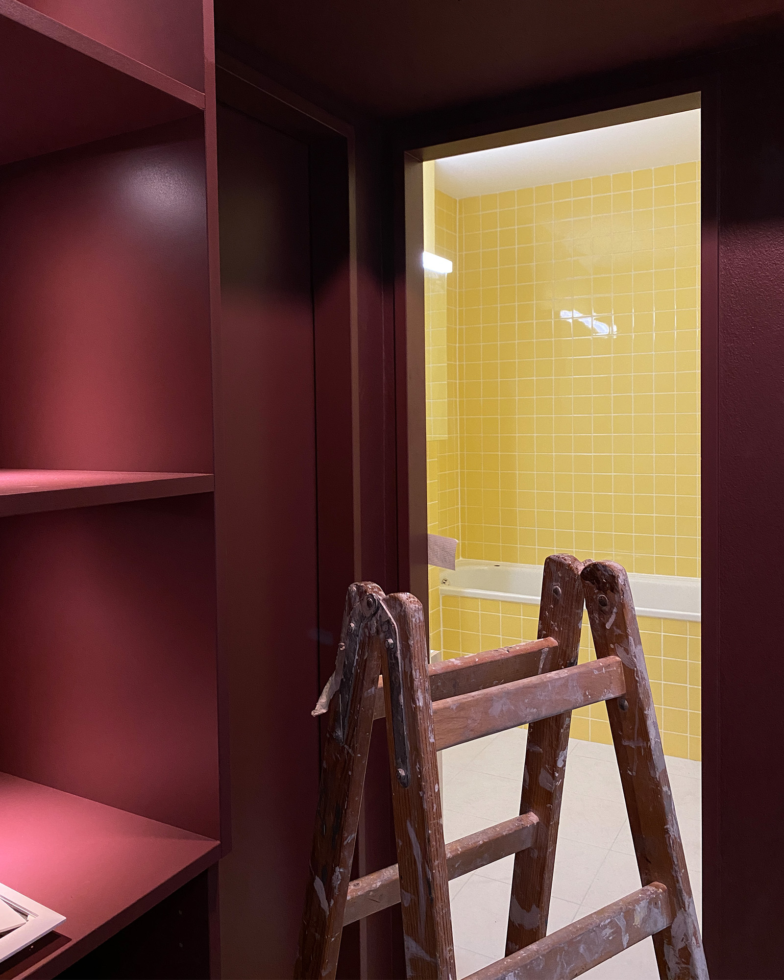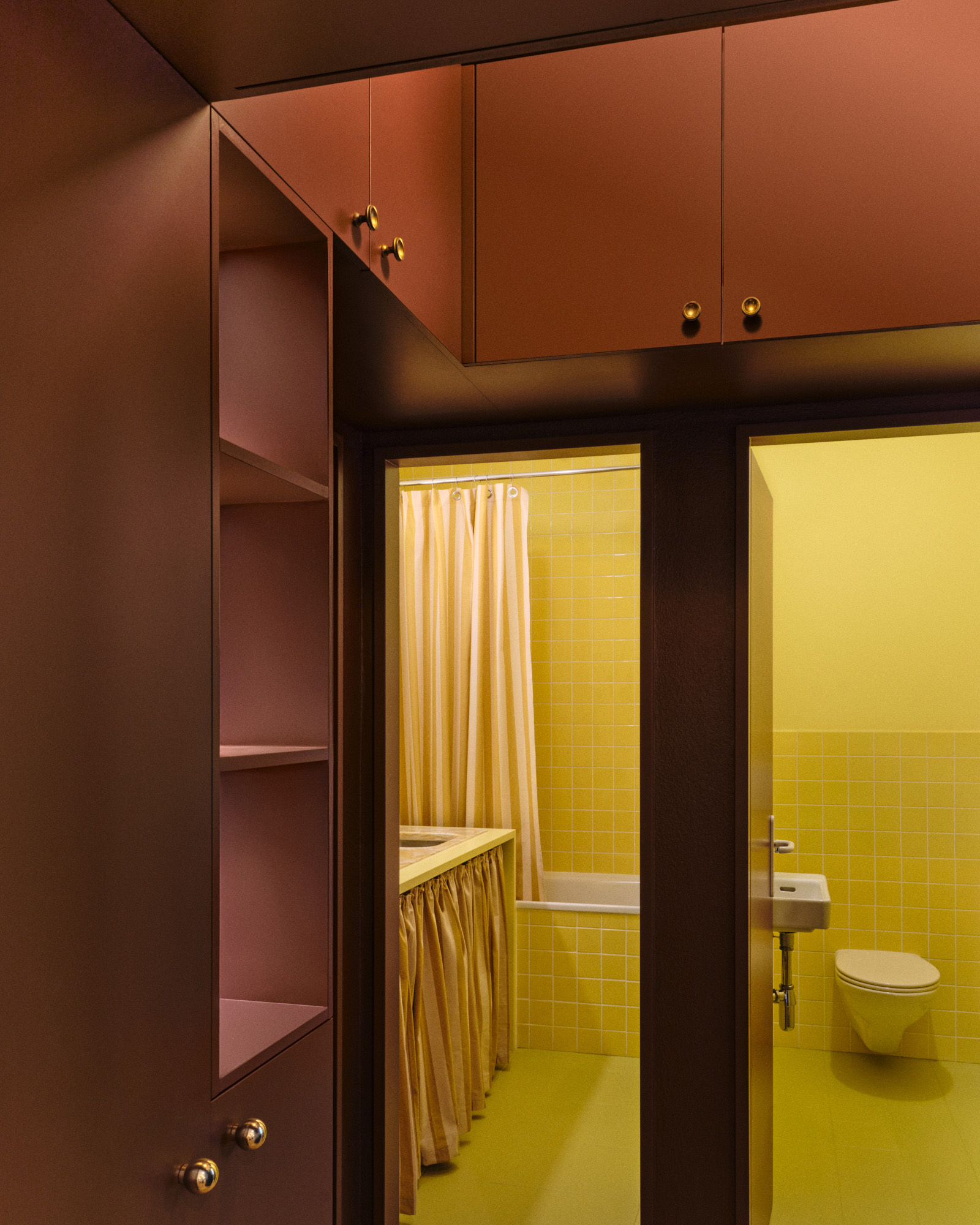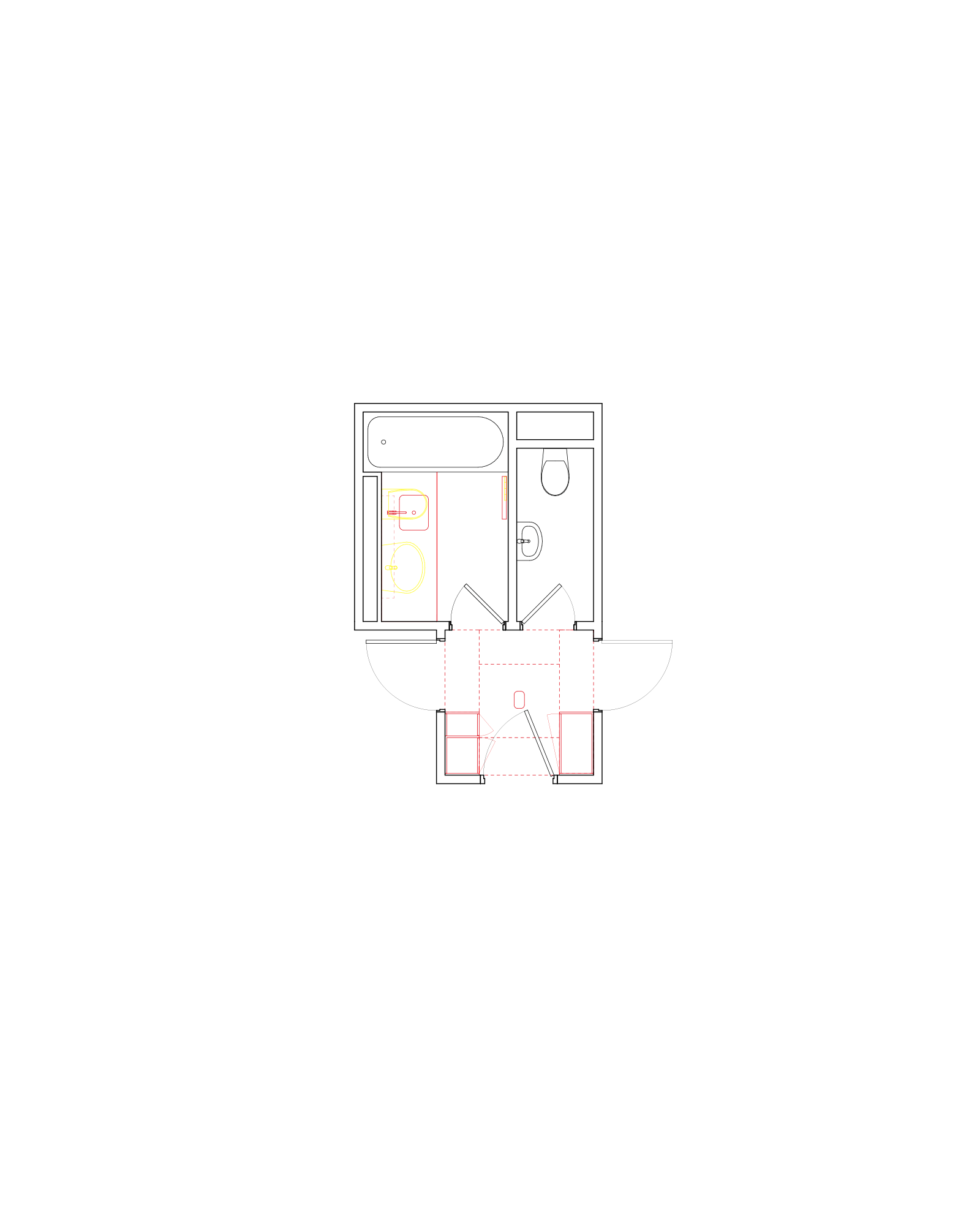 Rénovation des salles d’eau d’un appartement afin de s’adapter aux nouveaux besoins des usager.e.x.s de l’appartement. Le sas qui distribuent les salles d’eau et les chambres a lui aussi a été repensé de manière à devenir un espace de rangement au coeur de l’appartement où les moindres recoins sont exploités.  Le sas, traité dans un bordeau uniforme, crée une expérience immersive et recentre l’usager dans un espace calme et enveloppant. En ouvrant les portes, les salles d’eau jaunes apportent une lumière immédiate. Ces couleurs accompagnent et guident l’usager.e.x.s dans ses gestes quotidiens.